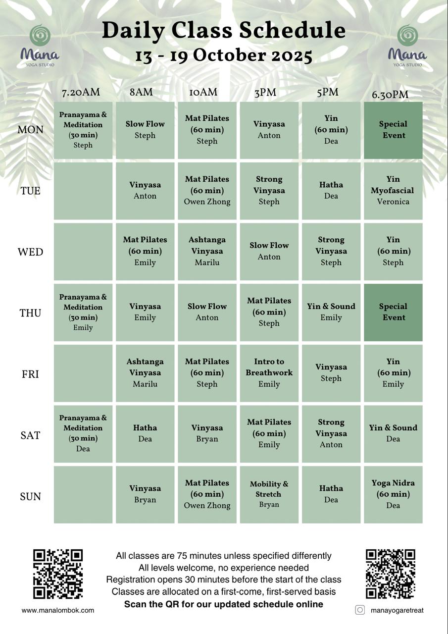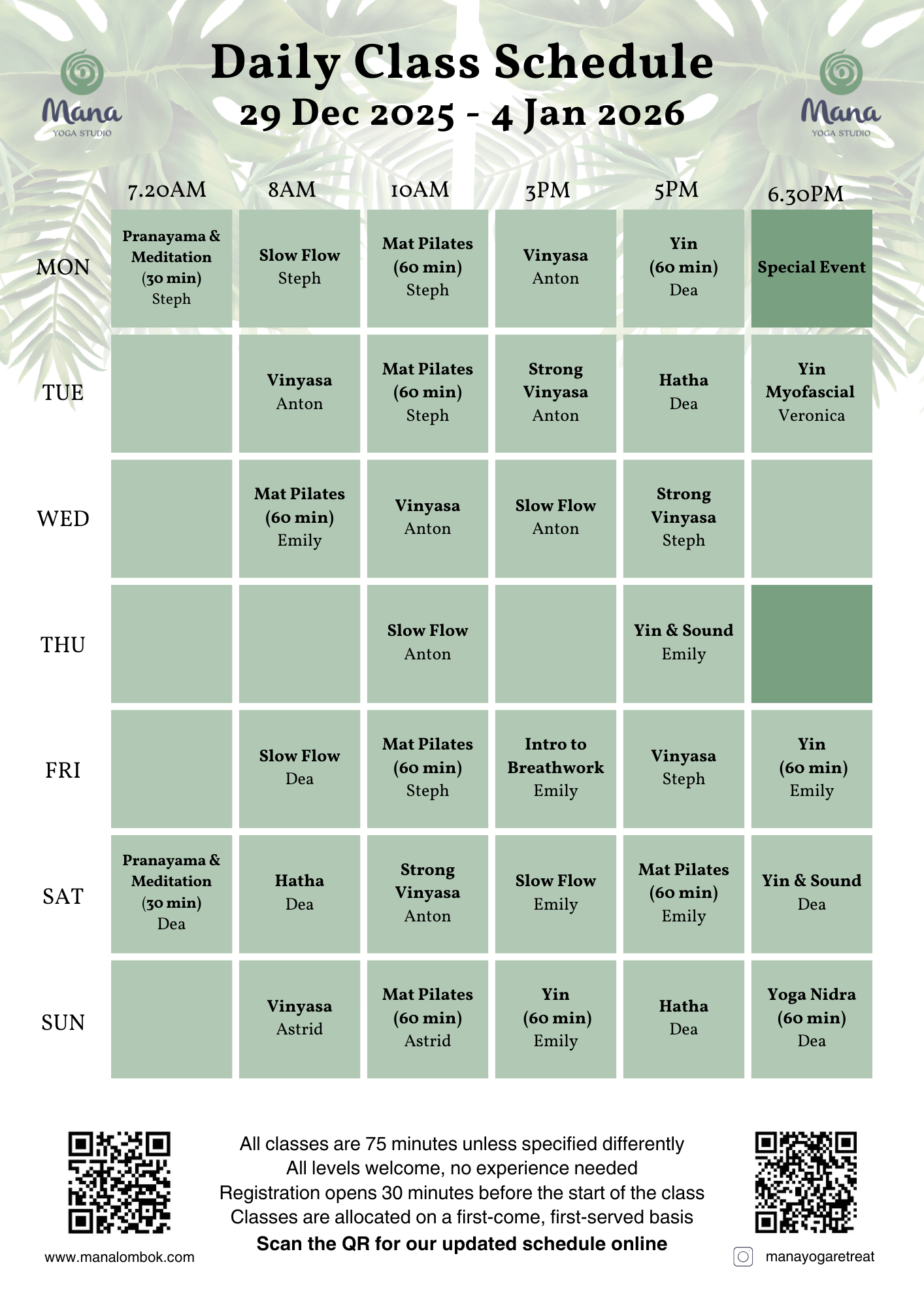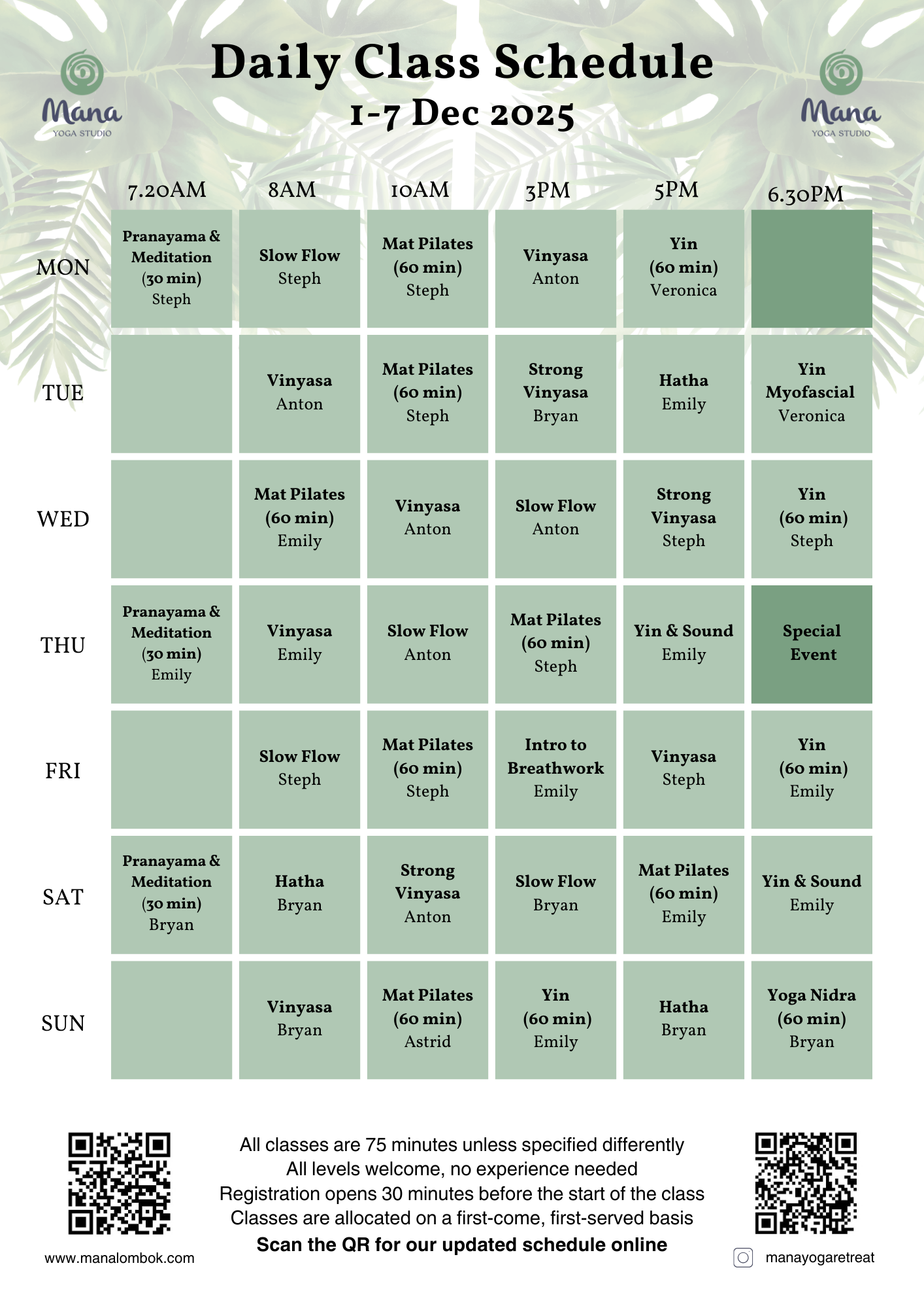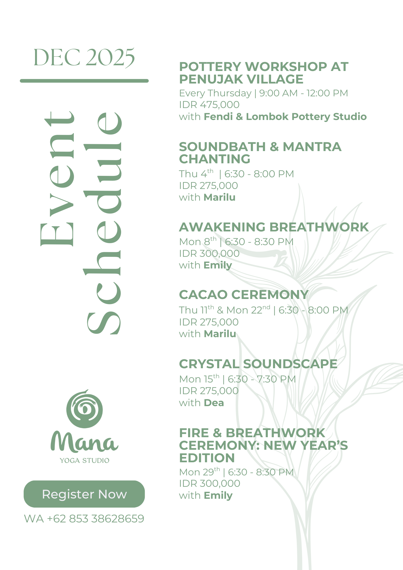 Join us for up to 5 daily classes, special events, workshops, retreats, and yoga teacher training. Mana offers the perfect blend of practice, growth, and community. Unfold your journey with us!